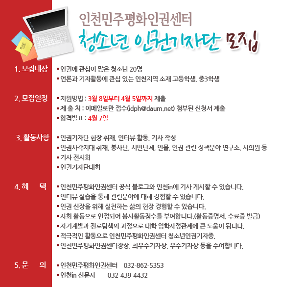 ○ 면접 : 30일 오전 10시, 인천민주평화인권센터(면접대상자 3월 23일 개별통보)