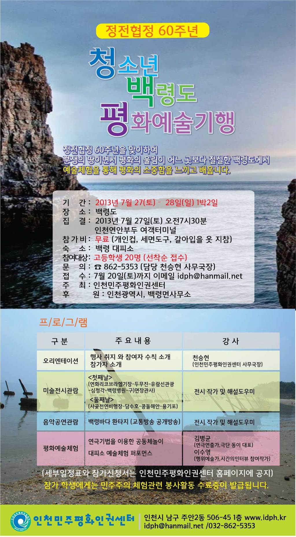정전협정 60주년 "727 청소년 백령도 기행" 신청