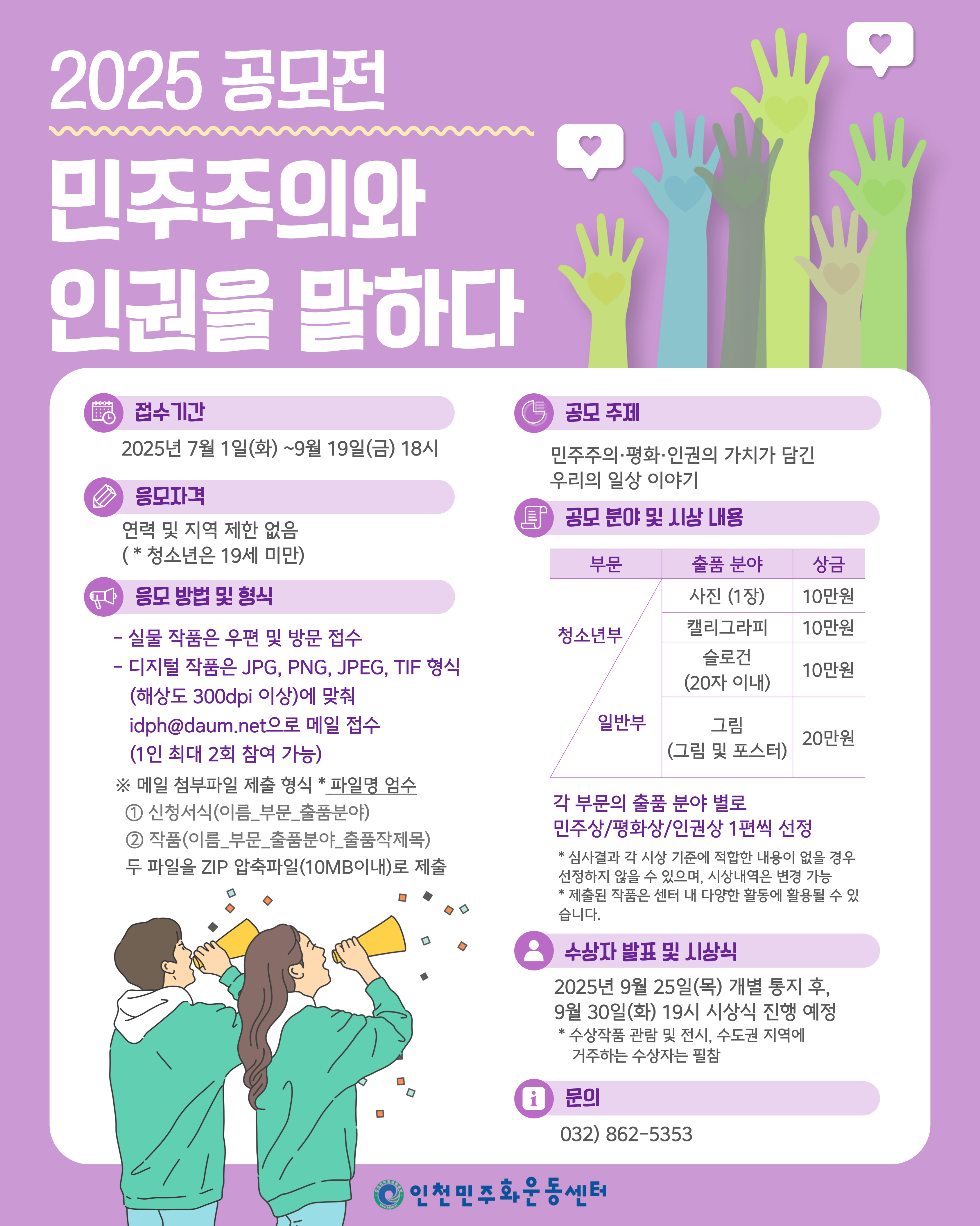 인천민주화운동센터에서는 민주주의, 평화, 인권의 가치를 시민들과 함께 나누고자 ‘2025 민주주의와 인권을 말하다' 공모전을 개최합니다.