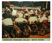 순식간에 경인 국도는 환자들의 의족이나 의수가 굴러다니고 환자들은 최루탄에 아우성치고 맞아서 비명을 질렀다. 경환자들이 중환자들의 휠체어를 밀고 있었는데 무술경관이 경환자를 발길질하여 중환자들이 휠체어와 함께 길바닥에 나뒹굴기도 했다.
