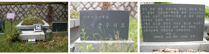 석광수 열사는 61년 강원도 삼척군 하장면 추동리에서 출생하여, 77년 세일포장에서 13만원의 임금노동자로 사회생활을 시작하였다. 20살 때 인천에 상경하여 계산동 주차장에 취직하여 어머니를 모시고 자취생활을 시작하였다. 82년 부평 강국택시에 입사, 3년간 근무하다가 취업을 못 한 친구를 위해 그 자리를 물려주고 강국택시를 퇴사했다. 86년 3월 공성교통에 입사하여 거의 만근을 할 만큼 성실히 근무하며 생활 하였고, 계산동 노틀담 수녀원에서 벌이고 있는 장애인 돕기 후원회원으로 없는 살림에 매달 3만원씩 후원회비를 낸 것으로 알려졌다. 열사는 친구소개로 91년 4월 6일 아내를 만나 결혼하고, 91년 3월 노조 대의원으로 피선되어 박용주 조합장을 도와 모든 조합 활동을 적극적으로 참여했다. 6월 14일 차량시위 당시 경찰들의 폭력적인 차량견인에 항의하여 선두에 서서 싸웠다. 지도부 및 조합원 열사 210여 명이 연행된 이후 회사로 돌아와 동료들에게 “혼자만 벌어 먹고살려고 하면 하루 갈 것이 일주일 간다”며 열변을 토하고 밤새 북을 치며 노동가를 부르다가 6시20분경 분신하였다. 열사는 사업주의 비열하고, 무책임한 임금협상과 공권력의 폭력진압, 무자비한 강제 연행에 항의하여 온몸으로 항거한 것이다. 그러나 회사 이사장은 사태의 책임을 지지 않기 위해 잠적하였고, 가족들의 보름이 넘는 농성과 노조 집행부의 노력으로 보상금, 장례비, 치료비를 받아내고 장례를 치렀다.묘역사진